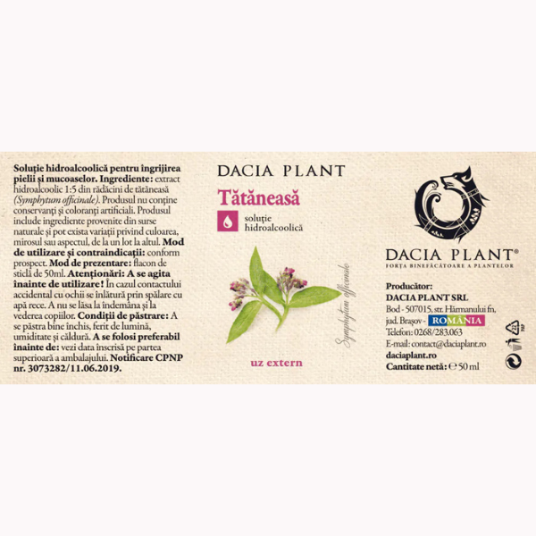 Ingrediente: extract hidroalcoolic 1:5 din rădăcini de tătăneasă (Symphytum officinale).